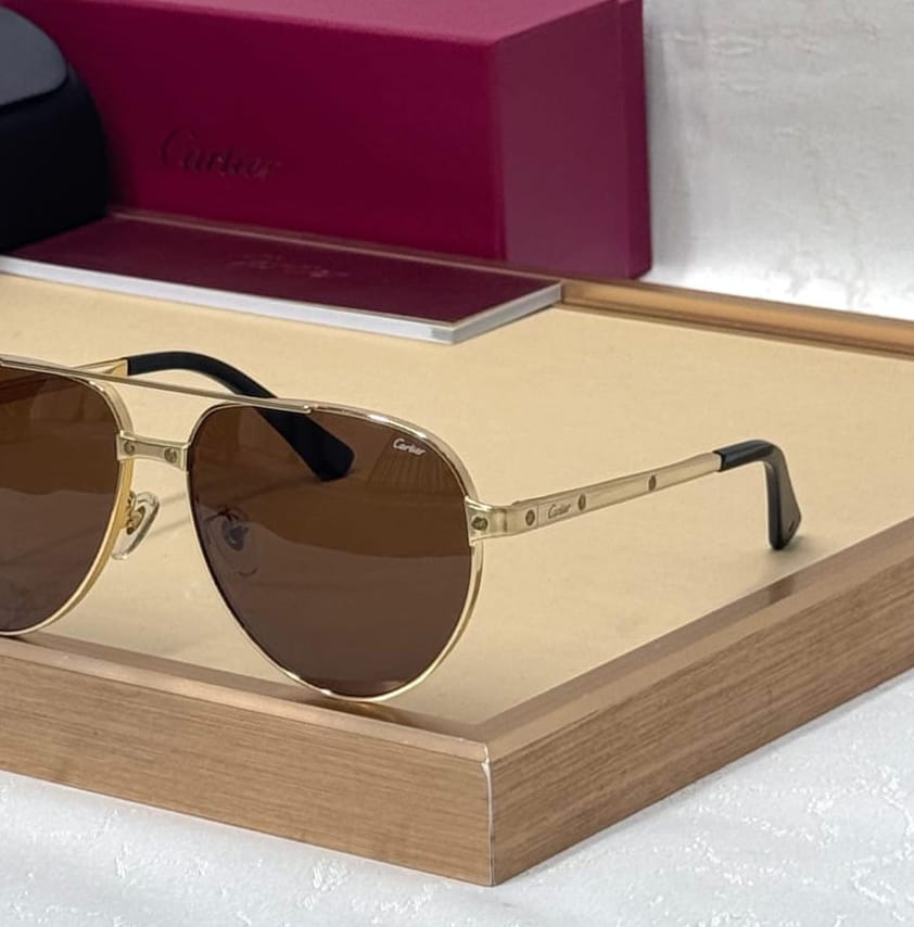 Accessorize your eyes and elevate your style with Cartier’s Sunglasses Collection. Enjoy a unique combination of design & function with this luxury eye wear. Cartier Classic Aviator sunglasses with a gold-metal frame and brown lenses