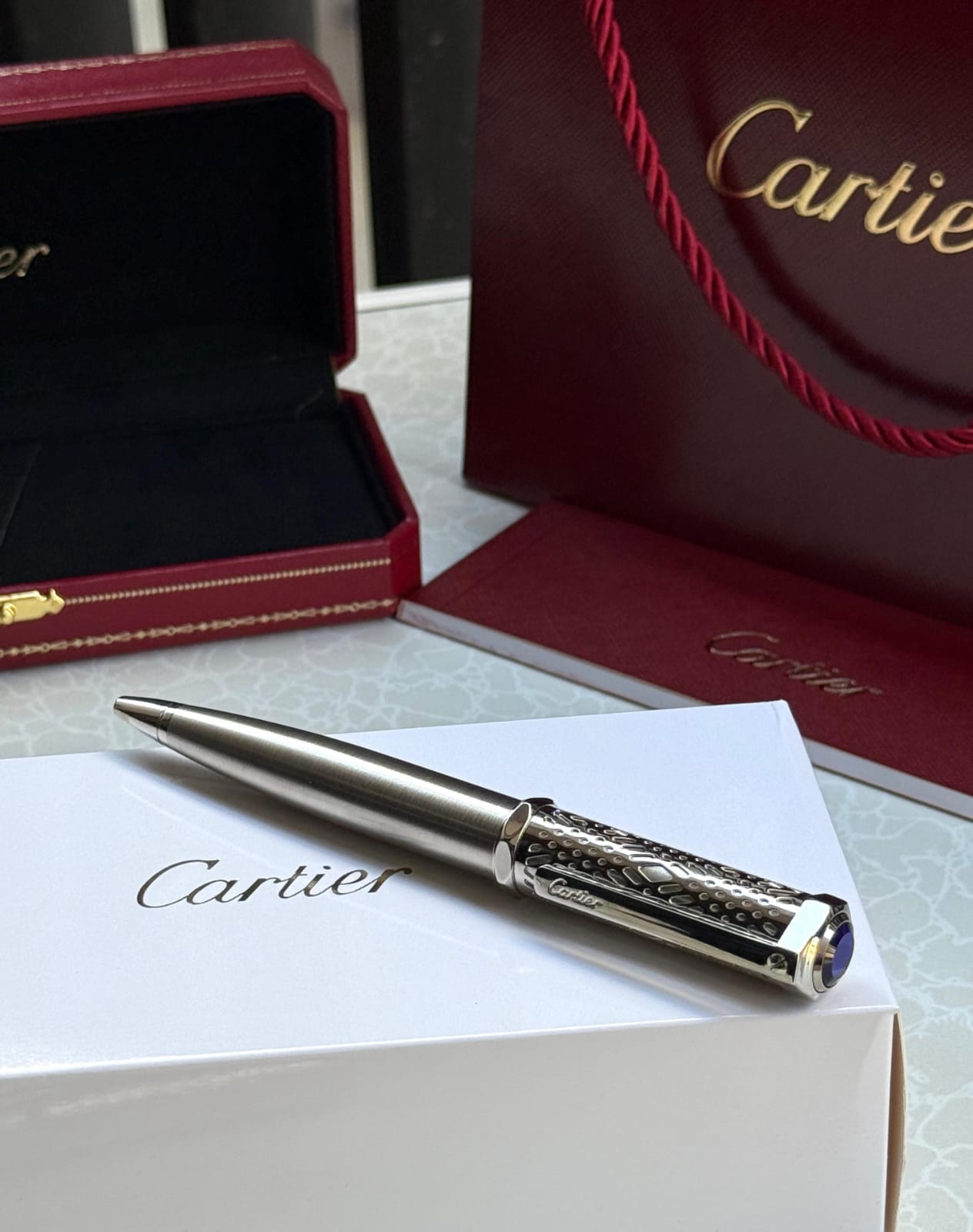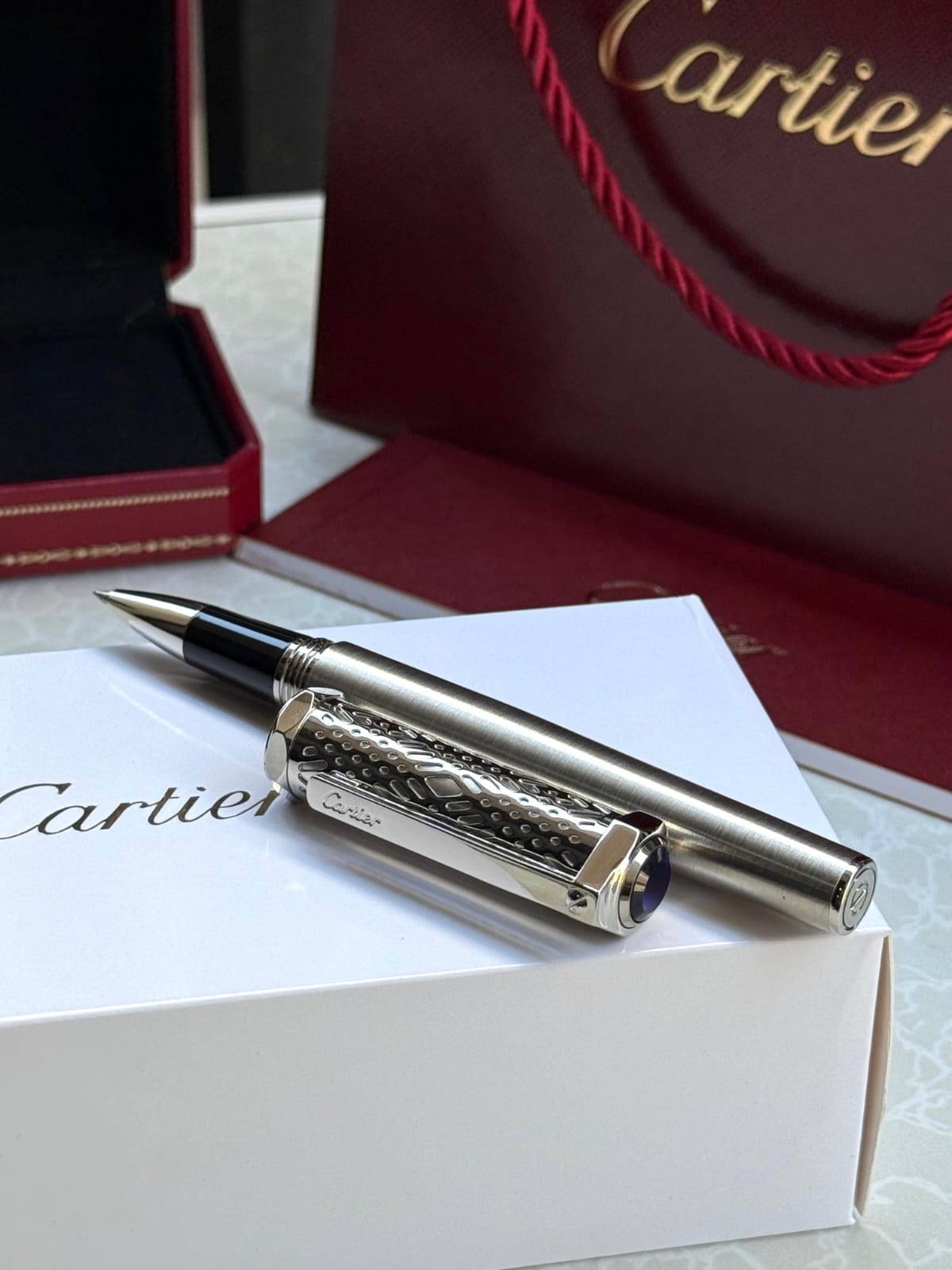 The Cartier Diabolo rollerball pen is a luxurious writing instrument characterized by its sleek, often black, composite body, palladium-plated or gold-finished trim, and signature blue resin cabochon crowning the cap. Designed for a smooth writing experience, this model is approximately 13.5 cm long, features a threaded cap, and uses a capless rollerball refill.