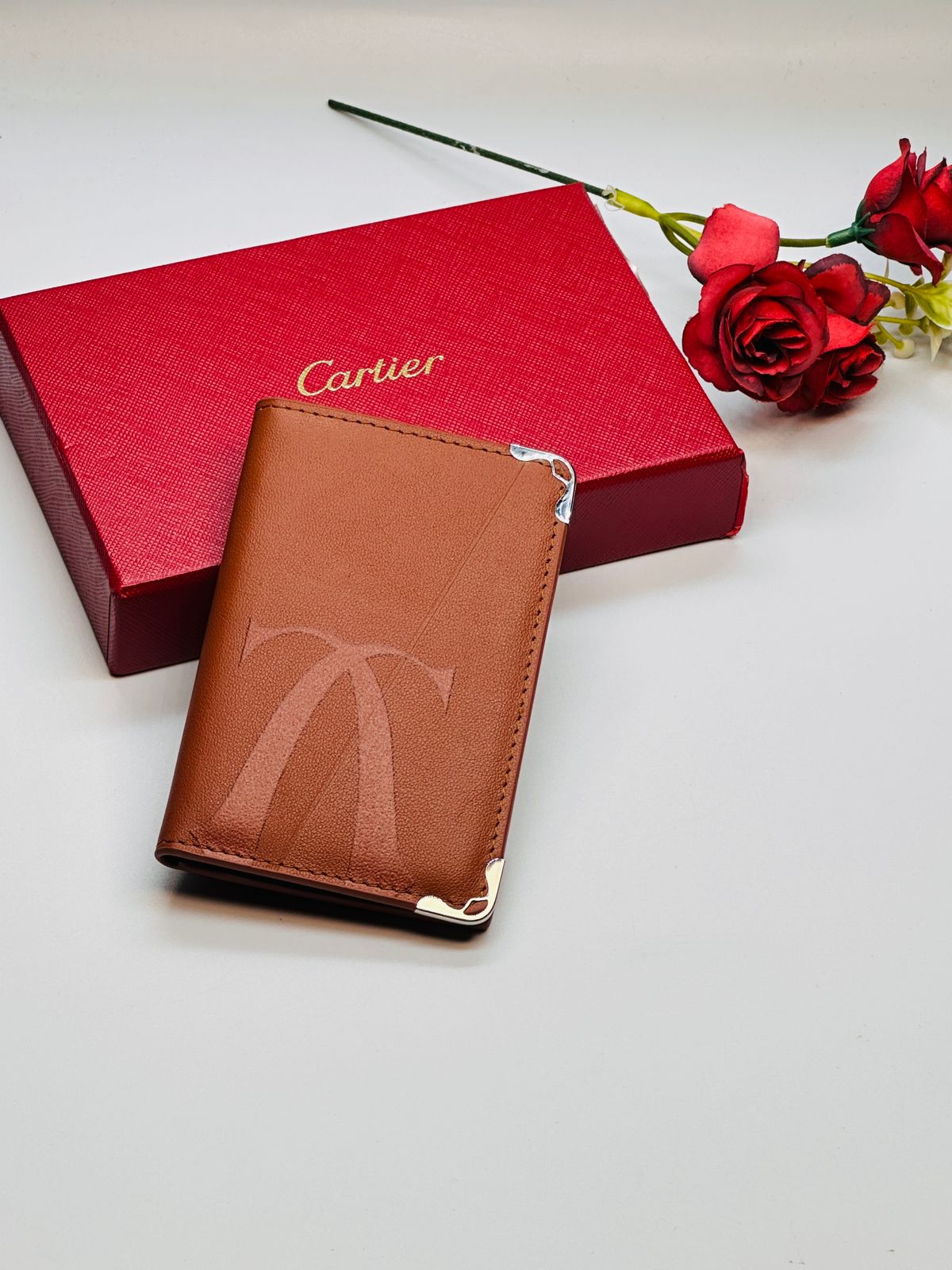 Cartier Must de Cartier brown leather double card holder wallet with gold-finish metal corners wallet is a sleek bi-fold design crafted from smooth calfskin leather, showcasing the house’s signature minimalist elegance. Accented with the iconic Cassandre logo on the front, it opens horizontally to reveal a well-organized interior with multiple card slots, bill compartments, and flat pockets for everyday essentials.