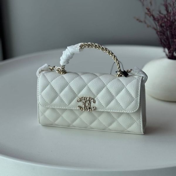Chanel Clutch with Gold Chain Top Handle is a sleek and elegant handbag crafted from quilted leather, featuring the brand’s signature diamond-stitch pattern. It has a structured top handle and a versatile gold-tone chain strap, allowing it to be carried by hand or worn over the shoulder.