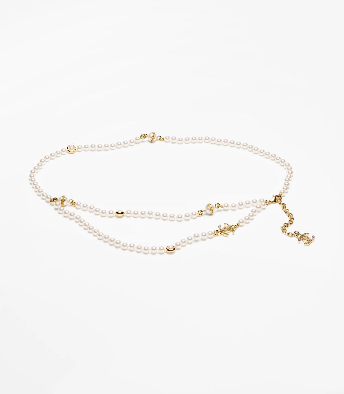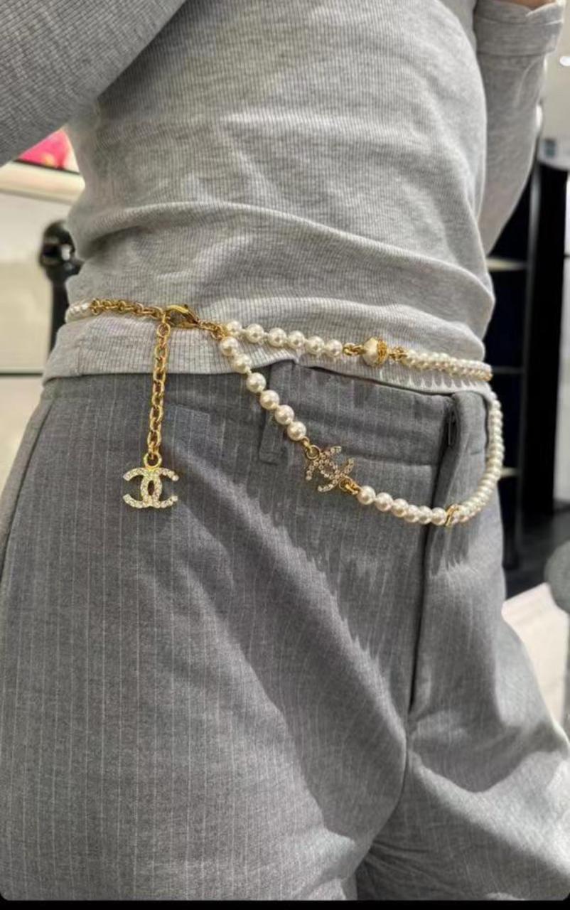 Chanel waist belt features a refined combination of classic white faux pearls and gold-tone metal chain detailing. Designed to sit delicately on the waist or hips, the belt is accented with iconic Chanel CC logo charms, some embellished with subtle crystal details for added luxury.