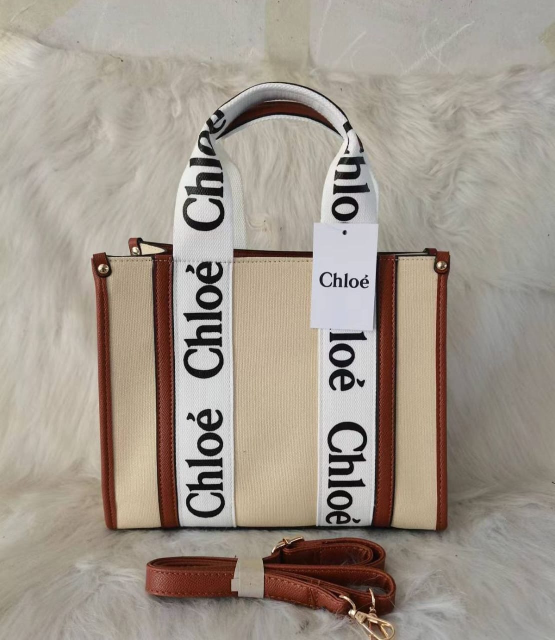 Chloé Small Woody Tote Bag in beige linen canvas with black leather trim and logo-print straps