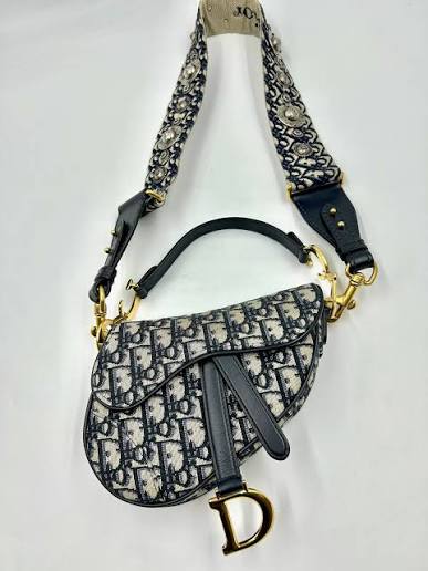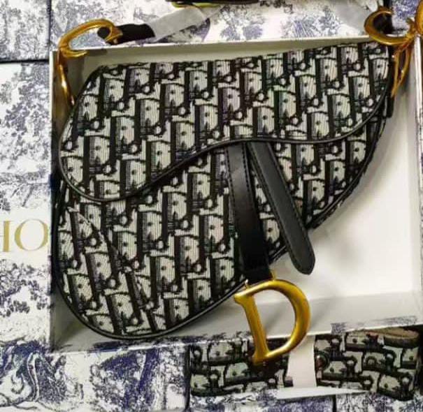 Christian Dior Oblique Saddle bag in  black cream canvas with an additional strap and gold-tone hardware. Accented with gold -finish metal D.I.O.R. charms, the bag exudes understated sophistication and classic Dior charm. Designed for versatility, it can be carried gracefully by hand or styled with a shoulder strap, making it ideal for both day and evening wear.