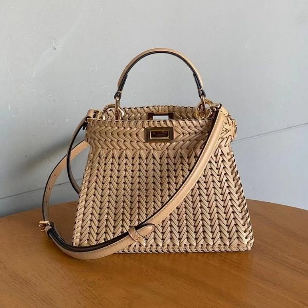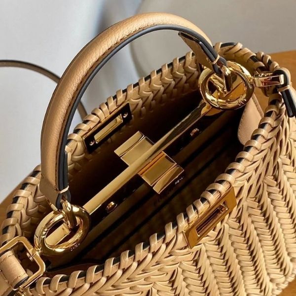 Fendi Peekaboo Mini Woven Leather Hand Bag with Crossbody Strap is a refined expression of Fendi’s iconic design, crafted from intricately woven leather that adds rich texture and artisanal character to its structured silhouette. Featuring the signature Peekaboo twist-lock closure, the bag opens to reveal a thoughtfully organized interior with dual compartments divided by a stiff partition, offering both elegance and practicality. It is designed with a sturdy top handle for hand carry and comes with a detachable, adjustable crossbody strap for versatile styling.