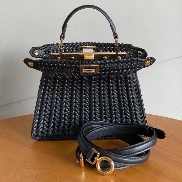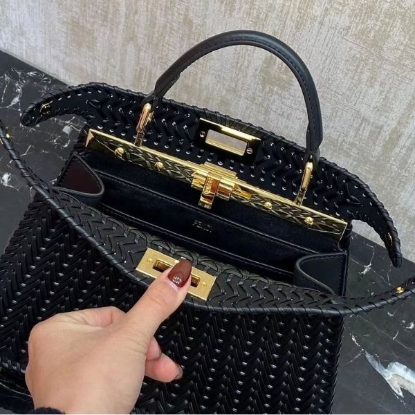 Fendi Peekaboo Mini Woven Leather Hand Bag with Crossbody Strap is a refined expression of Fendi’s iconic design, crafted from intricately woven leather that adds rich texture and artisanal character to its structured silhouette. Featuring the signature Peekaboo twist-lock closure, the bag opens to reveal a thoughtfully organized interior with dual compartments divided by a stiff partition, offering both elegance and practicality. It is designed with a sturdy top handle for hand carry and comes with a detachable, adjustable crossbody strap for versatile styling.