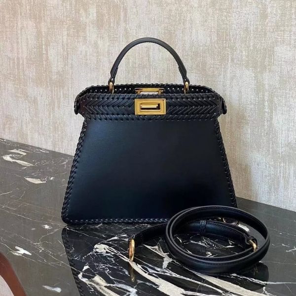 Fendi Peekaboo Multicolor Mini Woven Leather Hand Bag with Crossbody Strap is a luxurious, compact handbag that showcases Fendi’s masterful Italian craftsmanship through its intricately woven, multicolored leather exterior, giving it a distinctive and stylish look that stands out in any outfit. Like other Peekaboo minis, it features the brand’s signature twist-lock closures and opens to a lined interior with dual compartments separated by a structured partition, offering both elegance and practical organization for essentials.