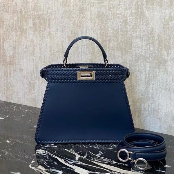 Fendi Peekaboo Multicolor Mini Woven Leather Hand Bag with Crossbody Strap is a luxurious, compact handbag that showcases Fendi’s masterful Italian craftsmanship through its intricately woven, multicolored leather exterior, giving it a distinctive and stylish look that stands out in any outfit. Like other Peekaboo minis, it features the brand’s signature twist-lock closures and opens to a lined interior with dual compartments separated by a structured partition, offering both elegance and practical organization for essentials.