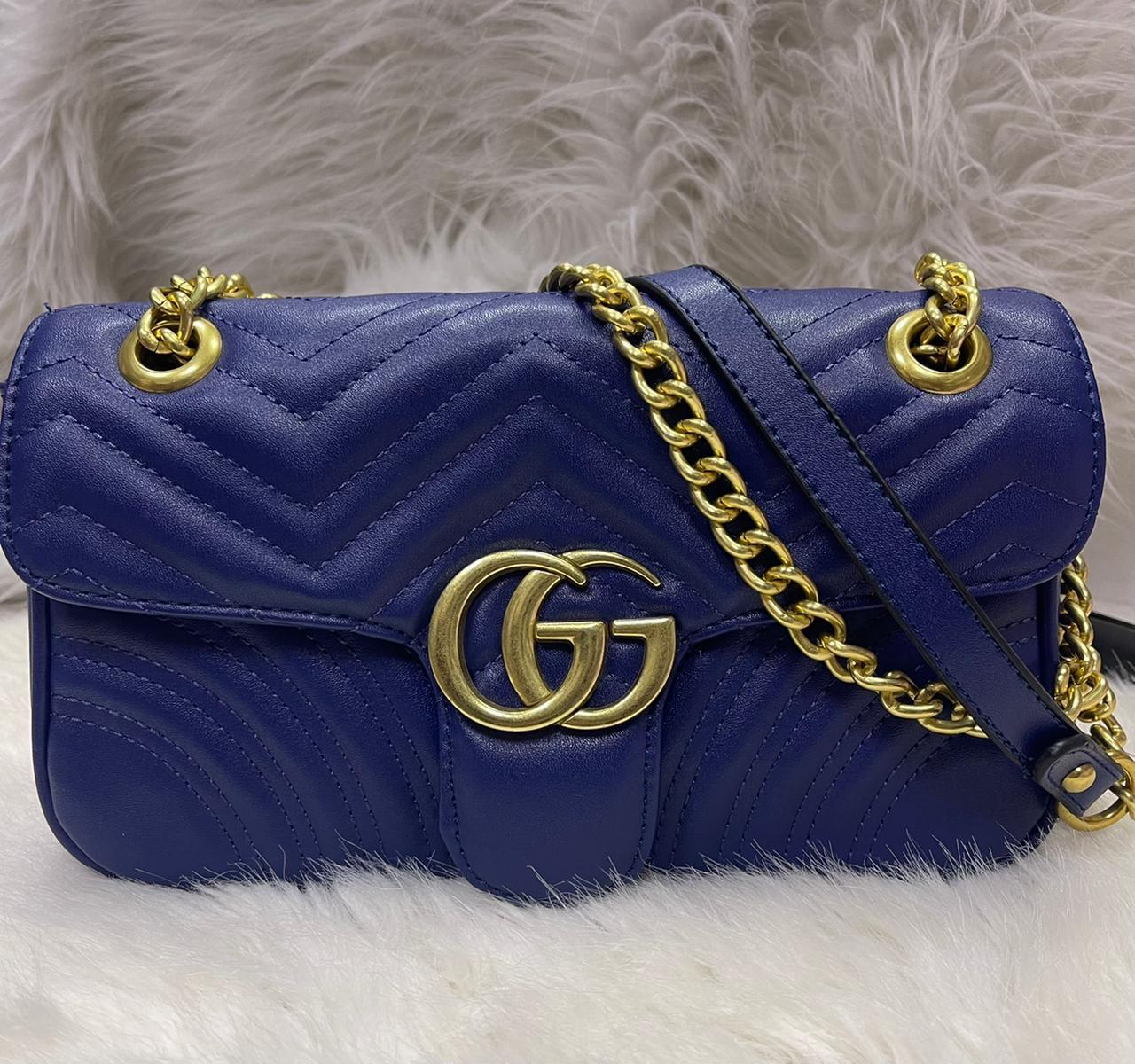 Gucci GG Marmont Small Matelassé Leather Shoulder Bag in Navy Blue with Double G and Gold-Tone Hardware
