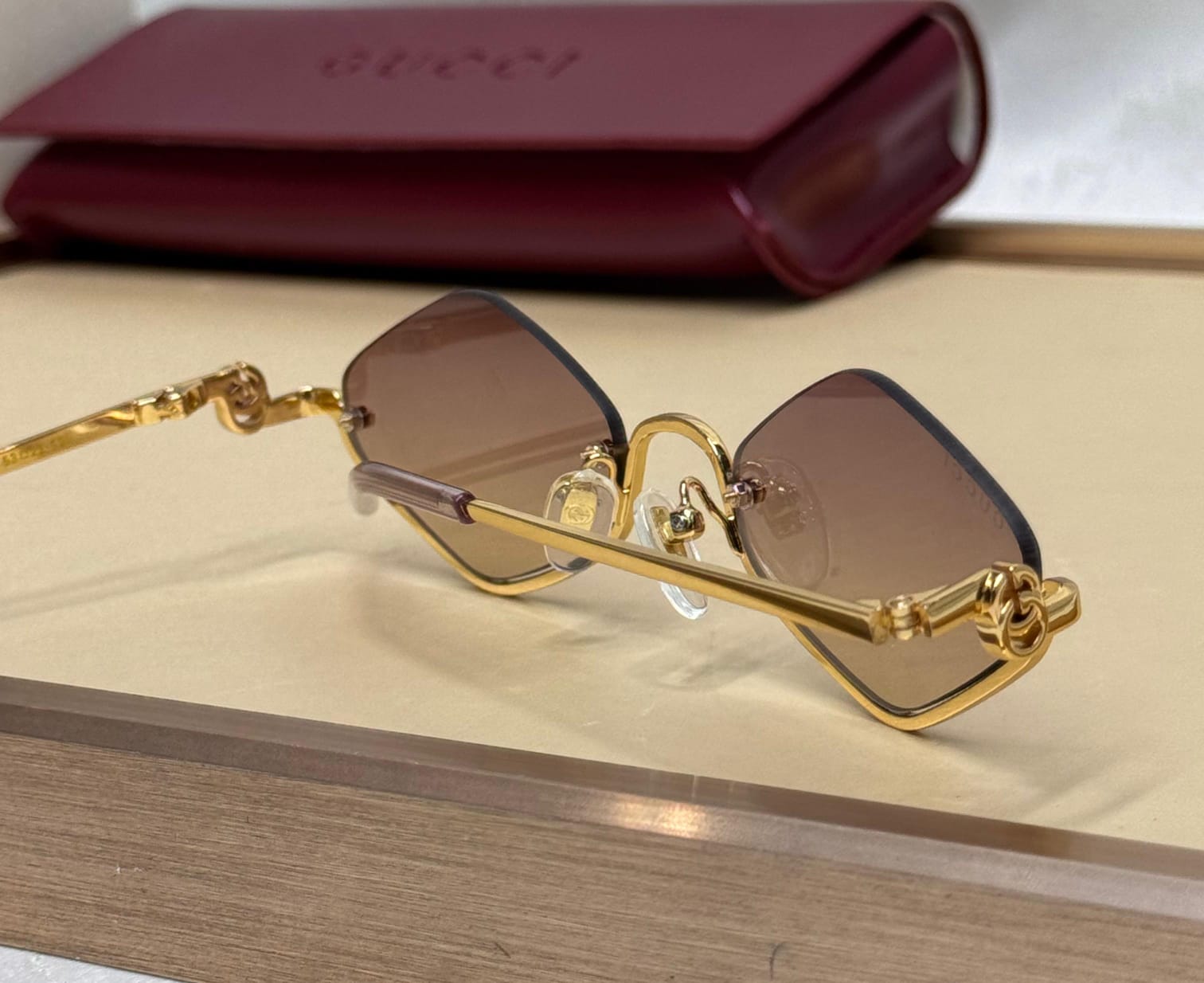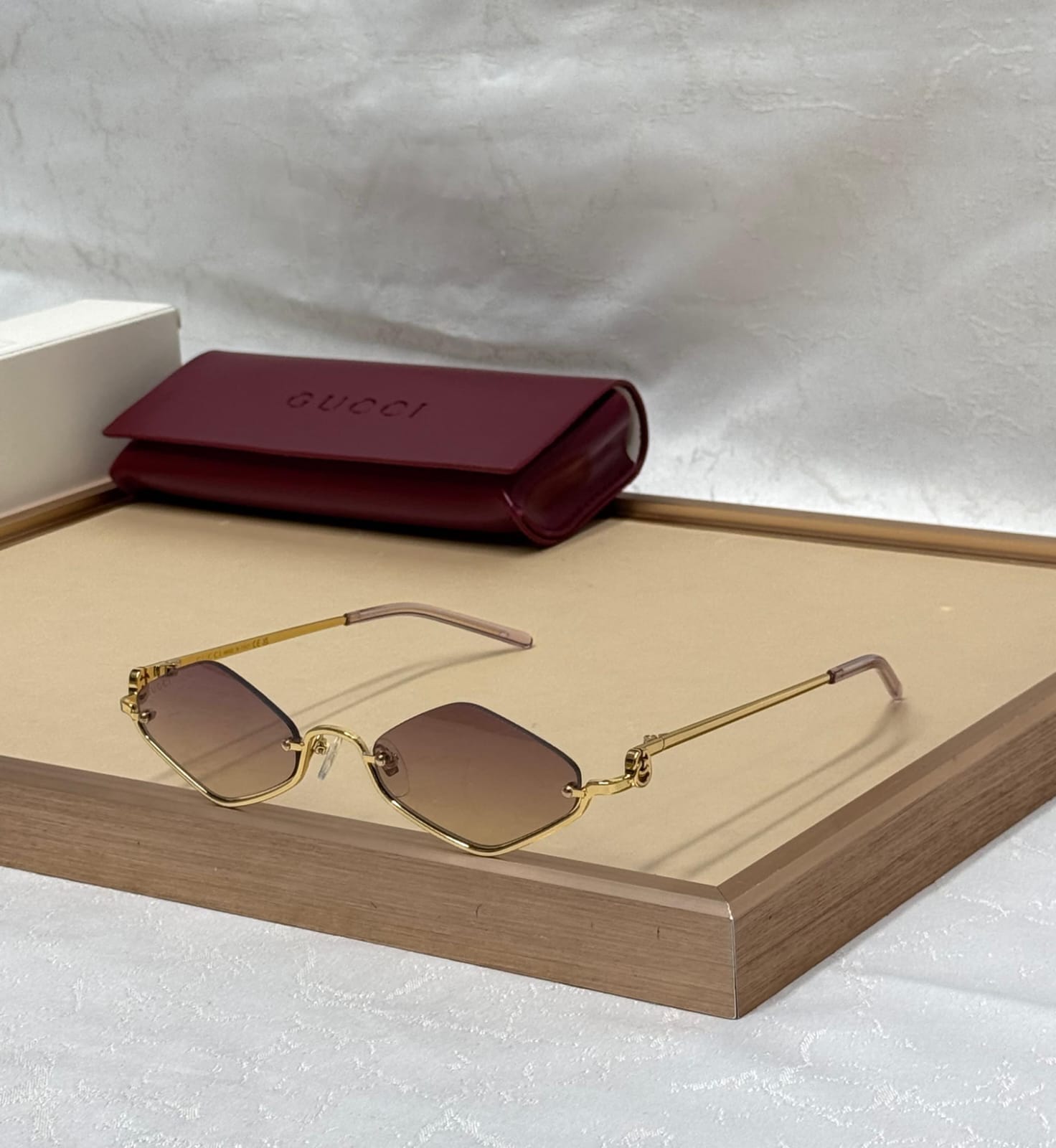 Gucci GG1604S rimless sunglasses with a gold metal frame and brown lenses, a chic fusion of modern design and iconic House heritage. The narrow cat-eye silhouette crafted in polished black acetate offers a sleek, flattering profile that adds instant sophistication to any outfit. On the temples, the signature Gucci Web stripe in blue and red delivers a recognizable and stylish accent rooted in the brand’s storied equestrian history.