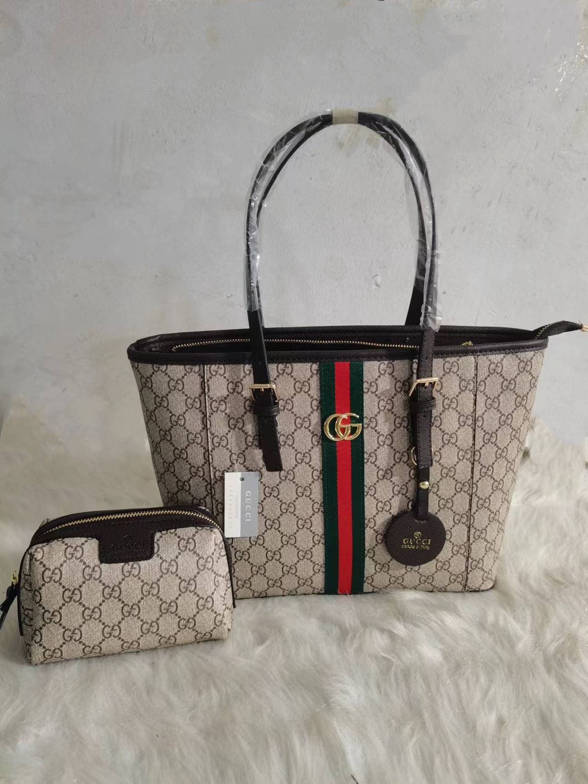 Gucci Ophidia tote bag is crafted from the iconic GG monogram canvas, featuring the signature Web stripe running vertically down the front and finished with the classic double G logo hardware. Designed with structured top handles and leather trim, the tote offers a spacious interior suitable for daily use.