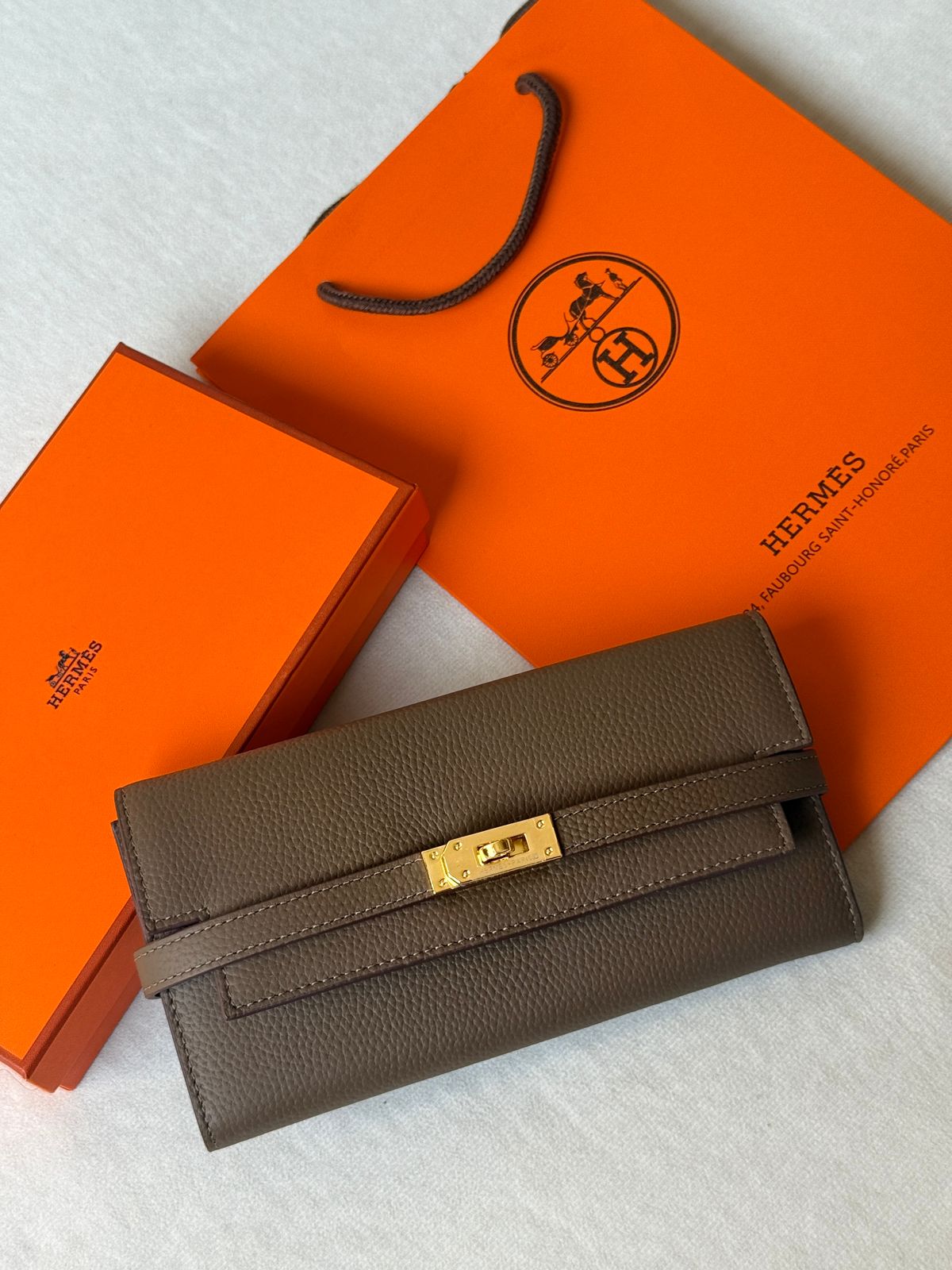 This Hermès Kelly long wallet is crafted from textured grained leather featuring the iconic Kelly strap and signature turn-lock closure inspired by the Kelly bag. The slim, structured silhouette offers an elegant yet practical design, ideal for daily use or evening wear.