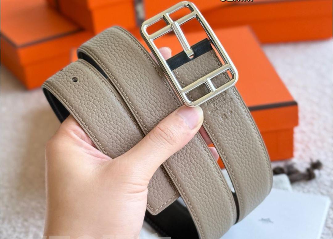 Hermès Royal belt buckle with a reversible leather strap in taupe and black calfskin with silver toned. belt is a refined, understated luxury accessory that blends minimalist design with subtle brand identity. Crafted in classic brown calfskin leather, it offers a sleek and versatile silhouette that pairs effortlessly with both casual and tailored looks.