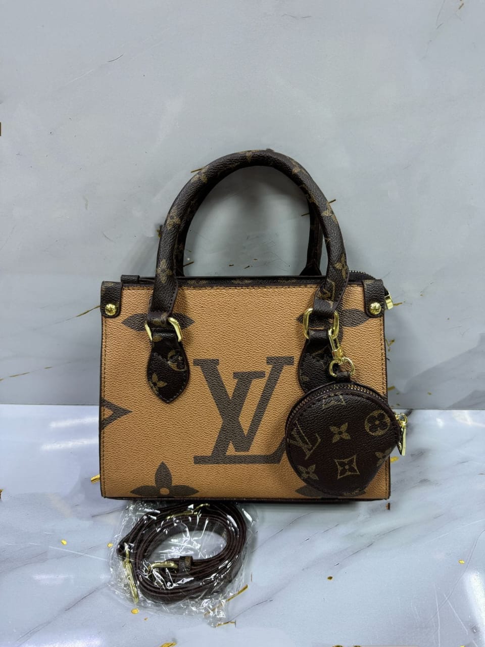 Louis Vuitton handbag in the classic brown monogram pattern