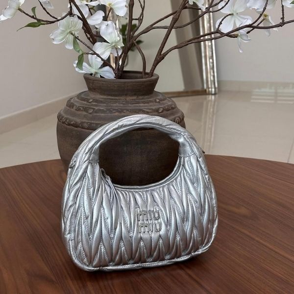 Miu Miu Leather Hobo Shoulder Hand Bag Silver 20cm