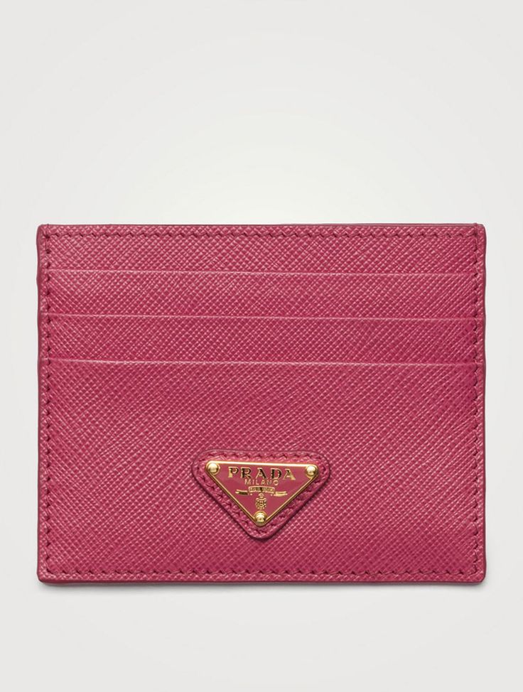 Prada Saffiano leather compact wallet/card holder featuring the iconic enamelled metal triangle logo on the front flap. Designed with multiple exterior card slots, a snap/flap closure, and a top zip compartment for coins, finished with gold-tone hardware.