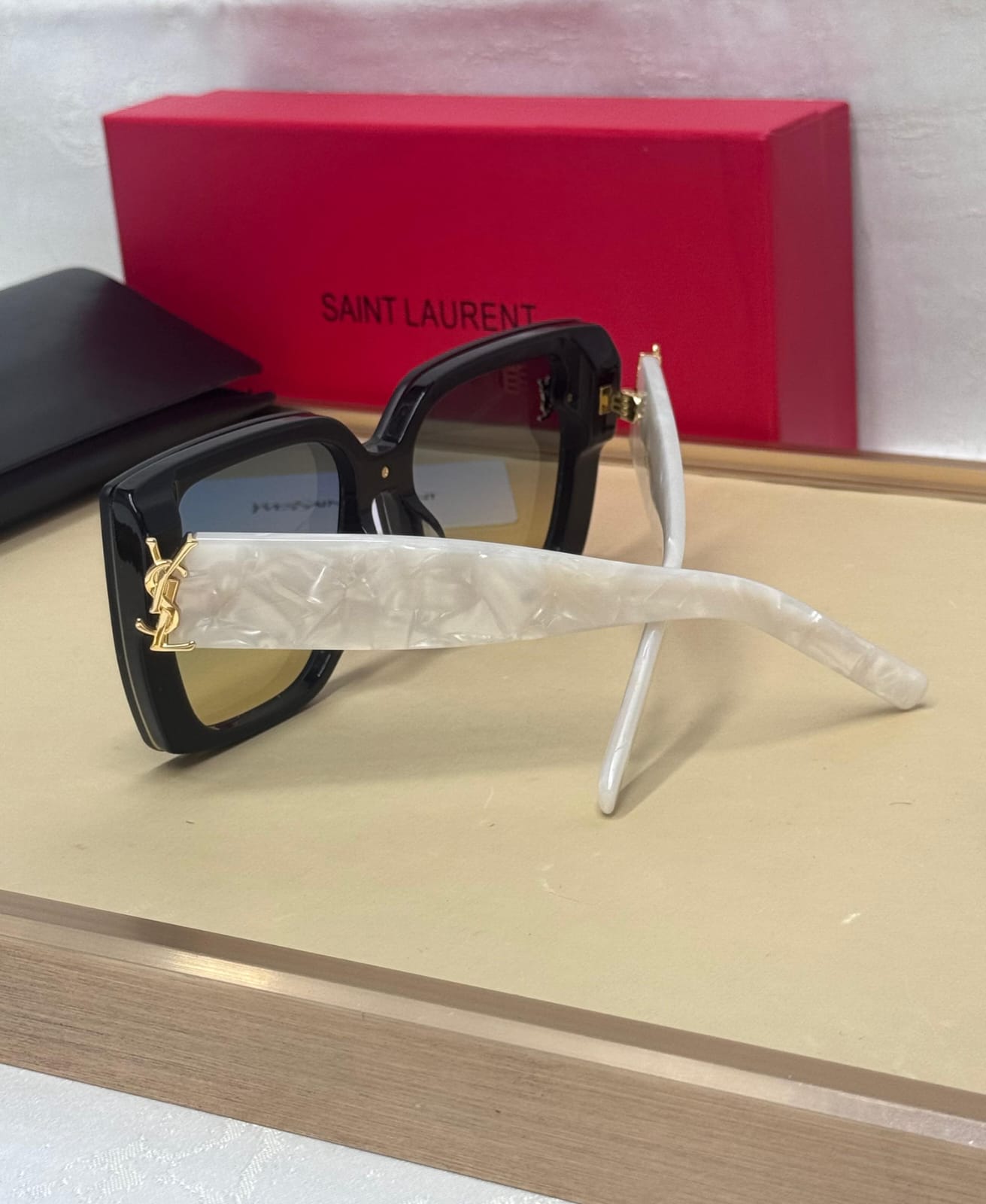 Saint Laurent sunglasses with a black frame and yellow-to-green gradient lenses. Equipped with high-performance lenses, these sunglasses provide exceptional UV protection, shielding eyes from harmful rays and enhancing visual clarity, promoting eye health without compromising style.