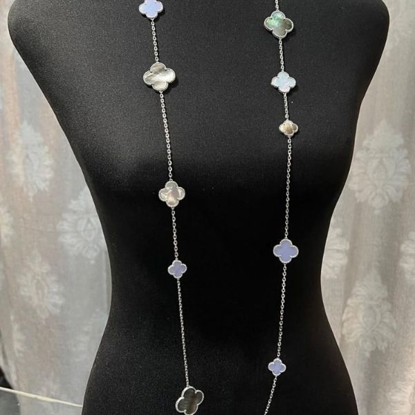 Van Cleef & Arpels long silver pearl big‑small motifs necklace would be a gracefully balanced and eye‑catching piece that blends classic elegance with artistic design. The extended silver chain—finished in a soft, polished sheen—cascades down the neckline, giving the necklace a fluid, luxurious drape that works beautifully with both casual and formal looks.