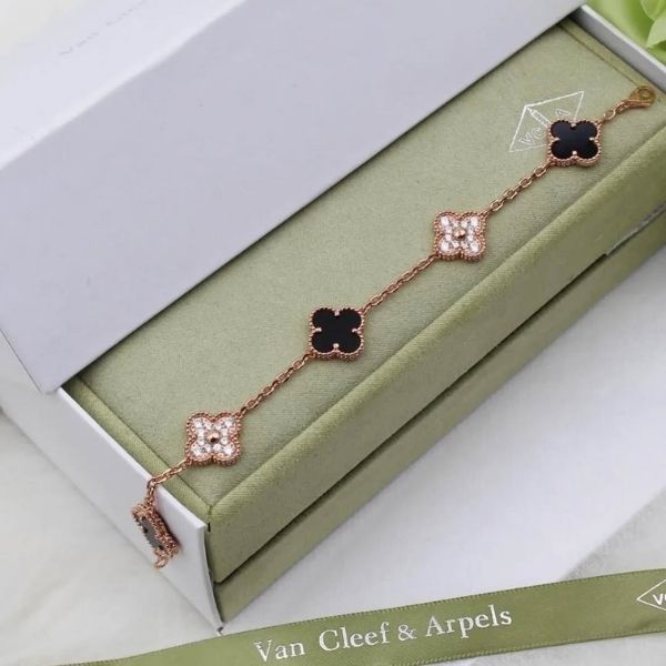 Van Cleef & Arpels silver bracelet with crystal motifs would be a graceful and luxurious piece that blends refined materials with artistic design. The bracelet’s silver—polished to a soft, luminous sheen—forms a sleek chain or linked band that sits comfortably around the wrist. Along the bracelet are carefully placed crystal motifs, each crystal cut to catch and reflect light, adding a subtle sparkle that enhances the overall elegance.